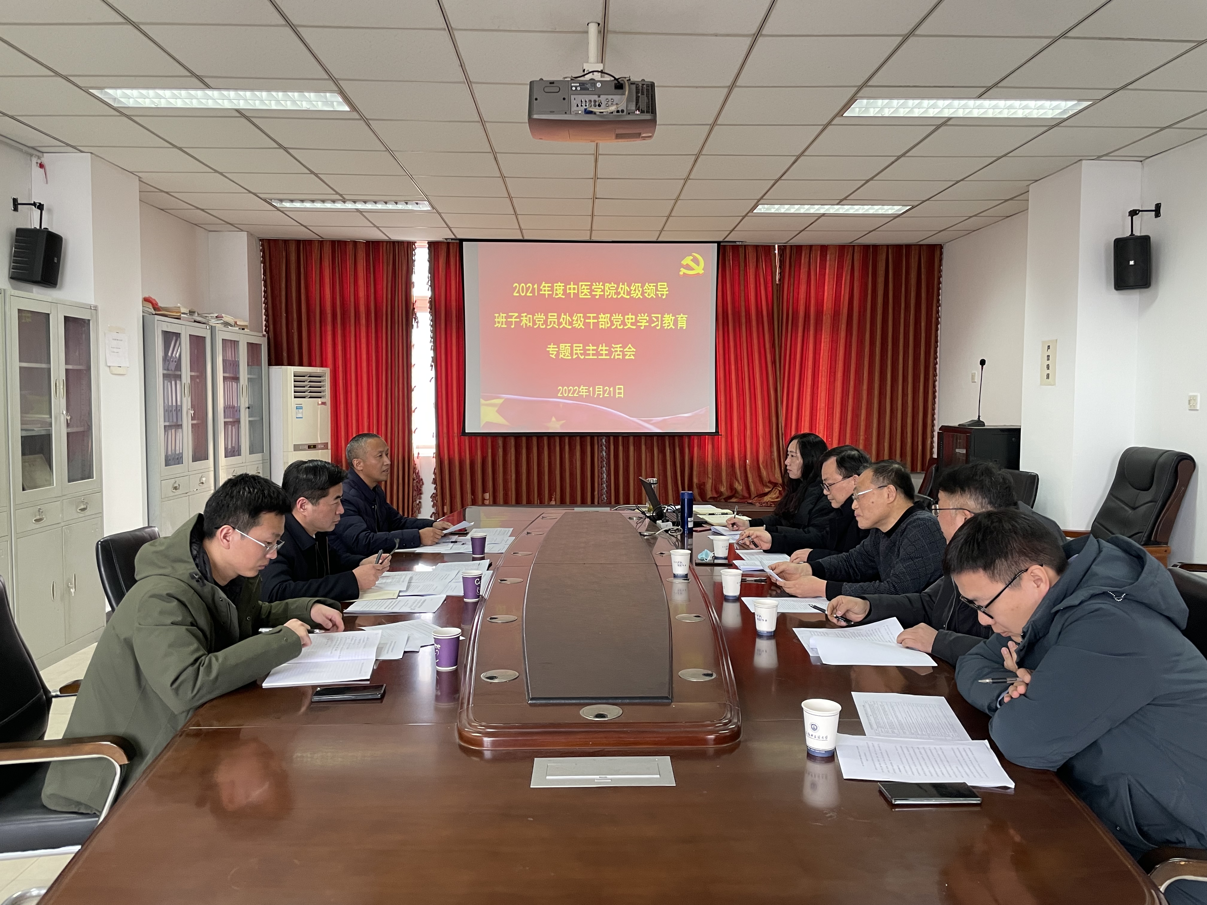 1月21日下午,中医学院党委在梅山路校区新安楼10楼会议室召开2021年度处级领导班子和党员处级干部党史学习教育专题民主生活会,学校党委组织部部长、校党史学习教育专题民主生活会第十指导组组长武刚,组织部副部长、第十指导组成员冯祥,组织部干部科科长、第十指导组成员任亚硕到会指导,中医学院党政领导班子参会,会议由学院党委书记杜明主持。