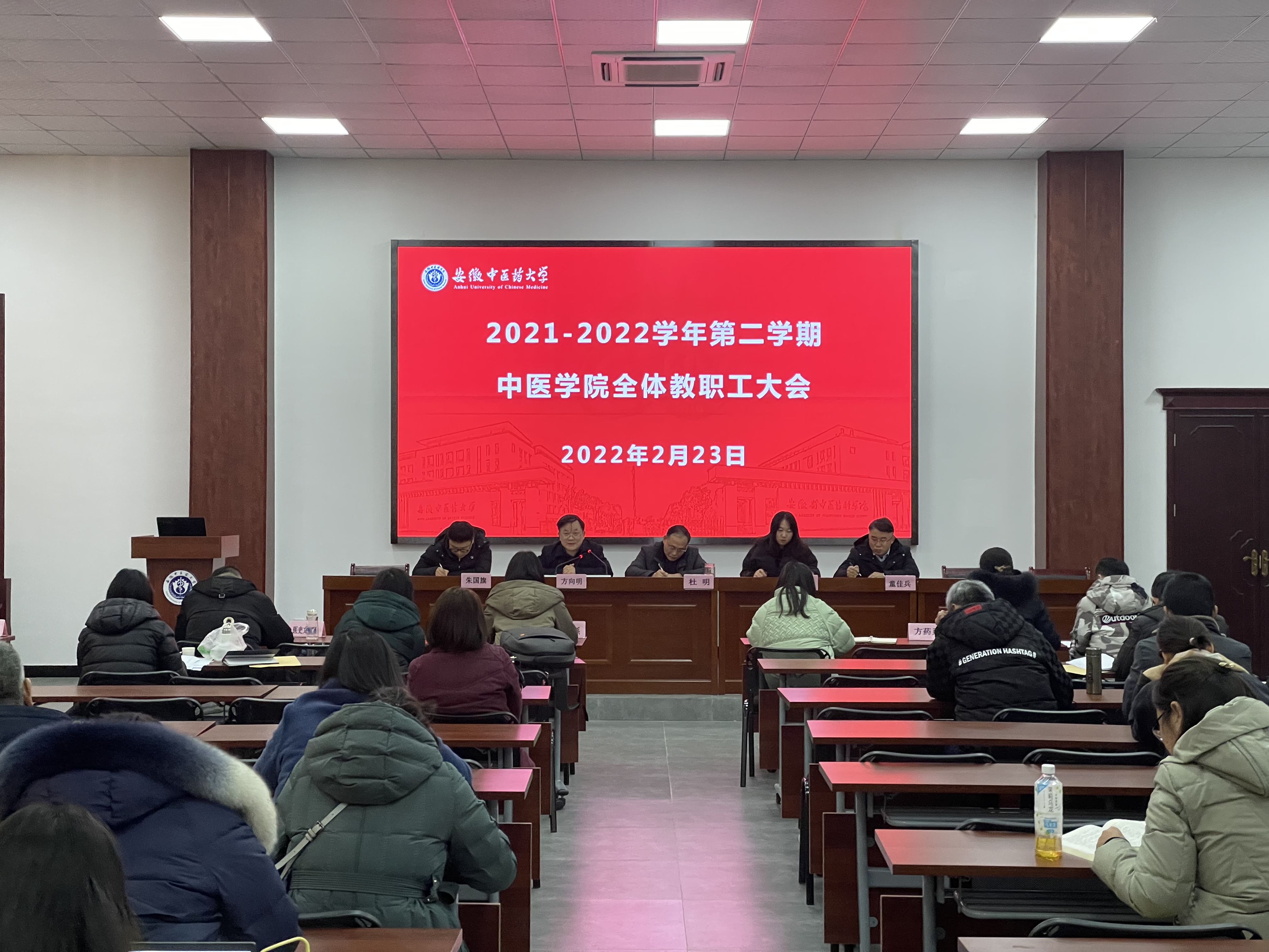 2月23日下午,中医学院组织召开2021-2022学年第二学期全体教职工工作会议,学院党政领导及全体教职工参加本次会议,会议由学院党委书记杜明主持。