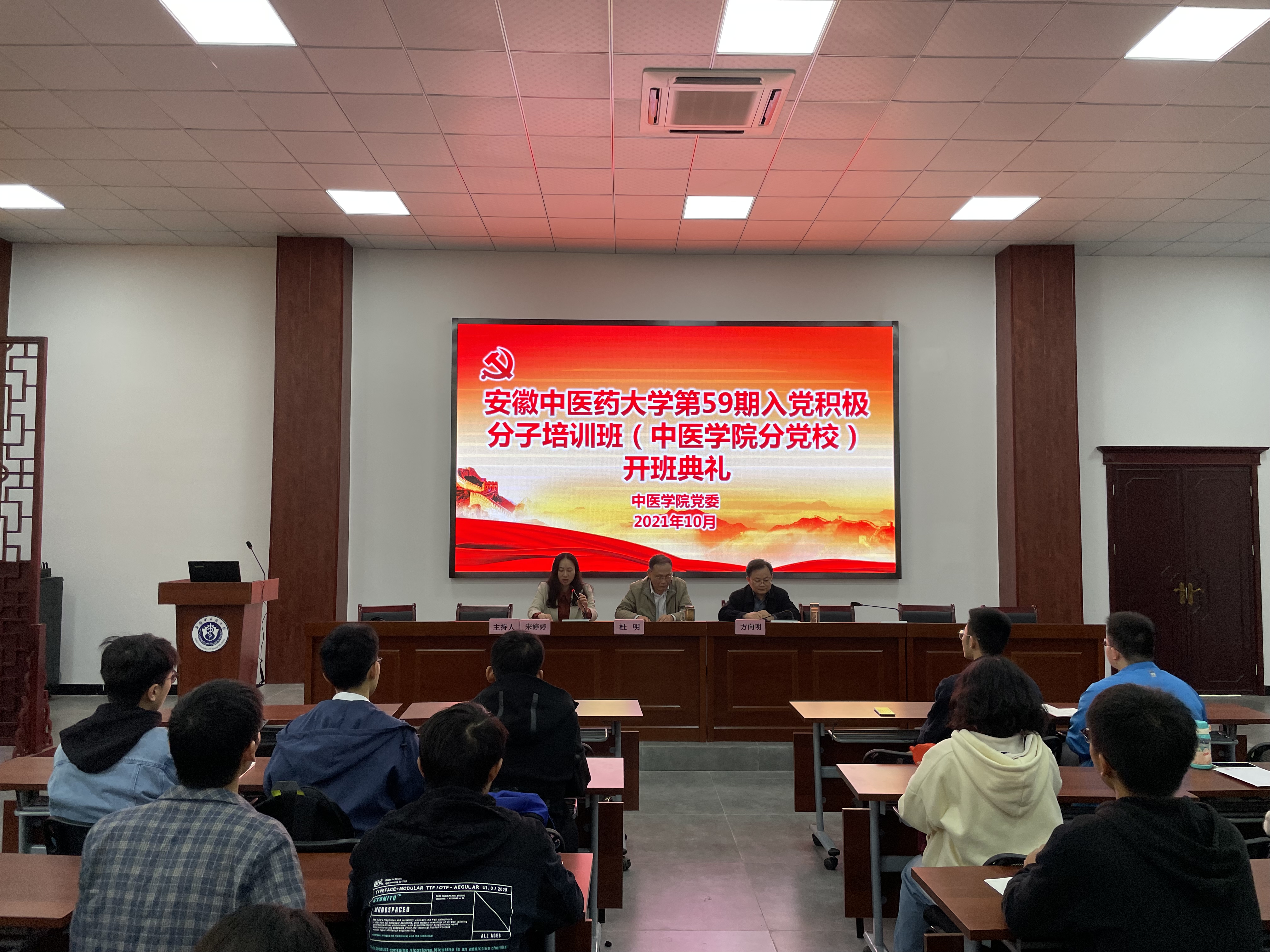 10月18日中午,中医学院党委在宅仁堂报告厅举行了第59期入党积极分子培训班(中医学院分党校)开班典礼,学院党委书记杜明、学院院长方向明出席典礼,中医学院2020级学生辅导员列席。典礼由学院党委副书记宋婷婷主持。