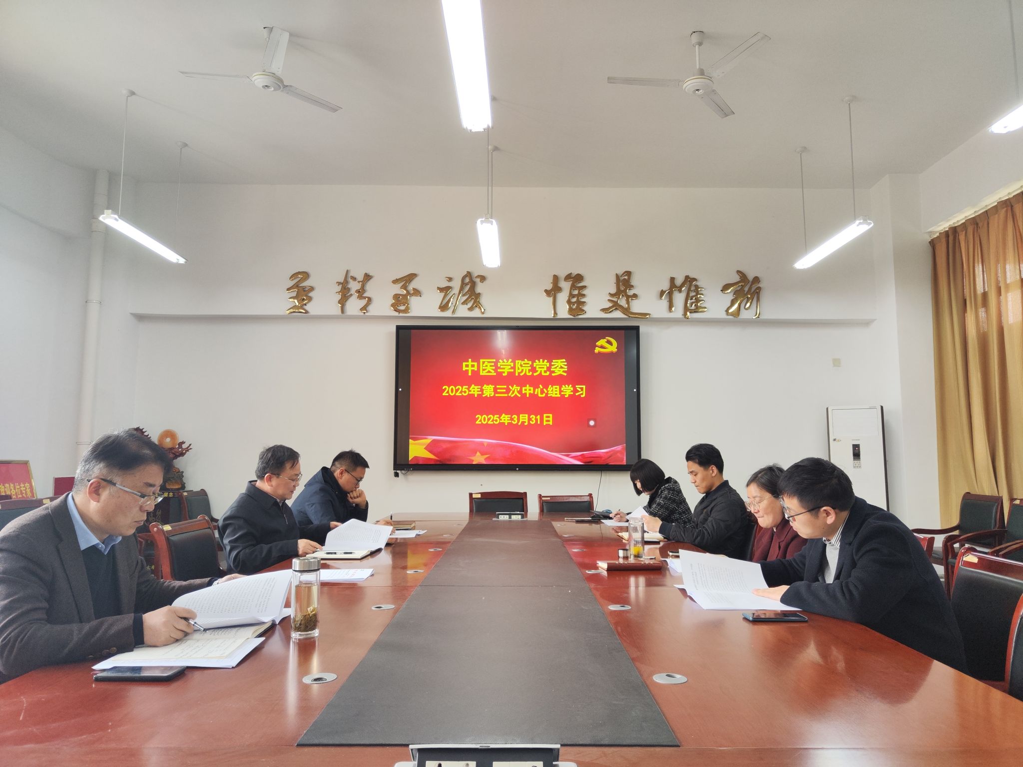 3月31日下午,中医学院党委围绕“统一思想,改革创新,推进中医学院高质量发展”这一主题召开了2025年第三次党委理论学习中心组学习会,学院党政领导、党委委员参加,青年学术骨干郭锦晨、博士生支部书记贾学昭列席,会议由学院党委副书记、院长方向明主持。
