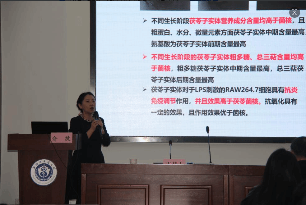 讲座中,俞捷教授结合其多年深厚的科研与实践经验,系统阐述了茯苓的生物学特性、优良菌株筛选方法与现代栽培关键技术。她围绕茯苓活性成分的发现、质量控制体系的构建及其在代谢性疾病防治中的应用研究等前沿领域,分享了团队取得的最新突破性成果。