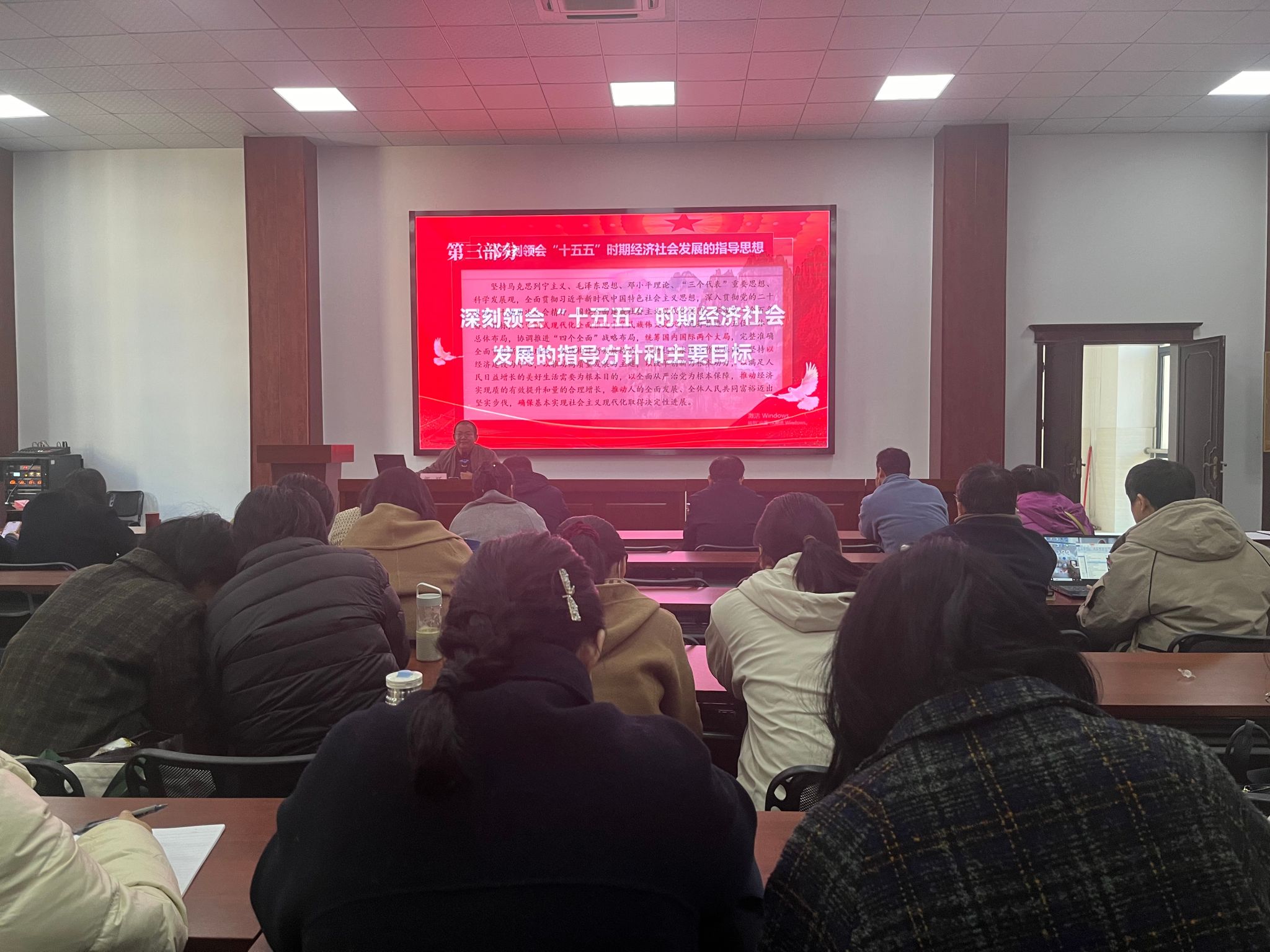 会上,郭跃围绕党的二十届四中全会是在即将进入基本实现社会主义现代化夯实基础、全面发力的关键时期召开的一次十分重要的会议,准确把握“十五五”时期在基本实现社会主义现代化进程中的重要地位,深刻领会“十五五”时期经济社会发展的指导方针和主要目标,全面理解“十五五”时期经济社会发展的战略任务和重大举措,坚持和加强党的全面领导、凝聚起推进中国式现代化的磅礴力量等五个方面,做了系统宣讲和阐释。