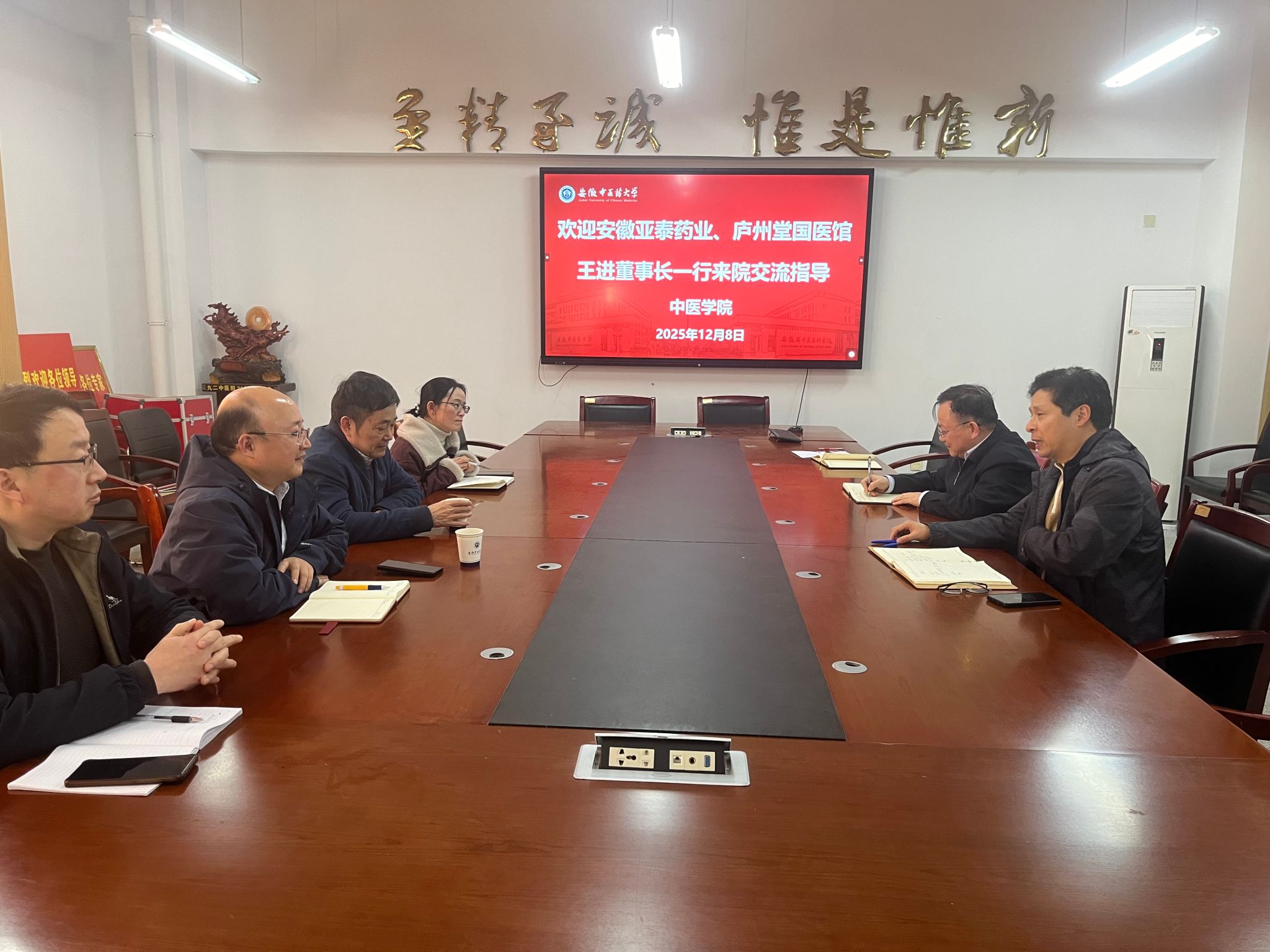 12月8日下午,安徽亚泰药业、庐州堂国医馆董事长王进一行到访中医学院,就深化校企合作事宜进行交流指导。中医学院党委书记张亚辉、院长方向明、副院长朱国旗及就业办秘书王洋洋出席会议。