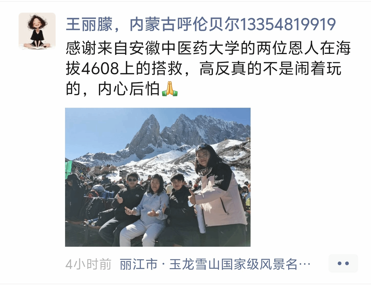当时,高兵老师正带领学生曹宇翔在云南进行中医药种植与乡村振兴项目调研。行至玉龙雪山景区时,他们发现一位中年阿姨突然晕倒,面色苍白,呼吸急促,情况危急。