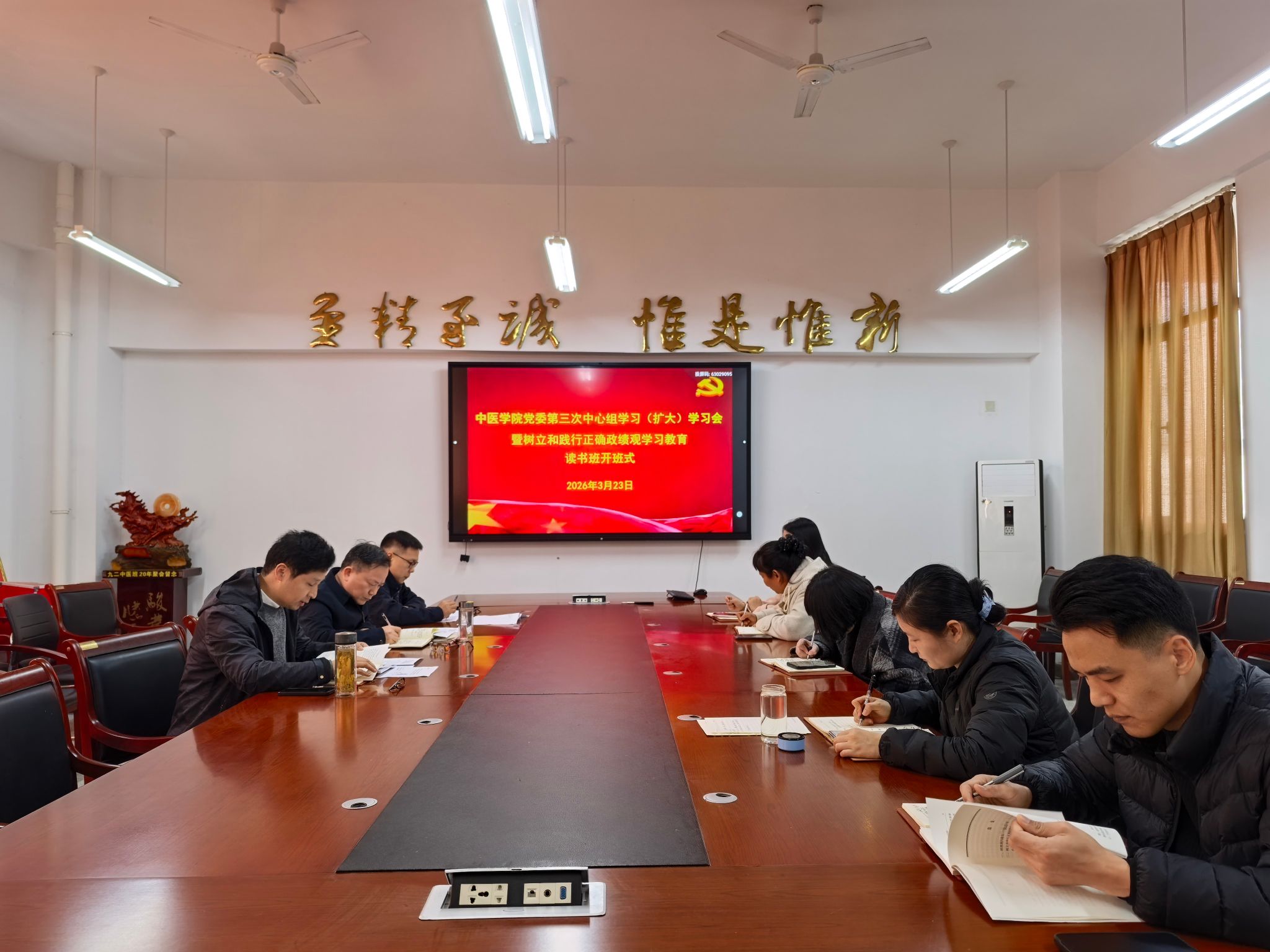 会上集中学习了《习近平关于树立和践行正确政绩观论述摘编》第一专题、第二专题“政绩观问题是一个根本性问题”“树立和践行正确政绩观,起决定作用的是党性”,传达学习了梁言顺同志在牢记“三严三实”树立和践行正确政绩观人大代表座谈会上的讲话精神、王清宪在中医药康养和文旅产业融合发展座谈会上的讲话精神,同时,传达学习了谢瑞瑾在学校树立和践行正确政绩观学习教育读书班开班式上的讲话精神。张亚辉在开班式上作总结发言,并对学习内容进行全面梳理。他紧扣学院“十五五”规划,强调要坚持学以致用,动员全体师生崇尚实干、狠抓落实;要求结合谢瑞瑾在调研指导中医学院“十五五”发展规划编制工作时提出的指示要求,拟订相关任务问题清单,明确逐项推进、逐条破题的工作路径。同时,他就推动党建与业务深度融合发展作出具体部署,统筹谋划下一阶段重点任务,确保“十五五”规划编制与学院高质量发展同向发力、协同并进。
