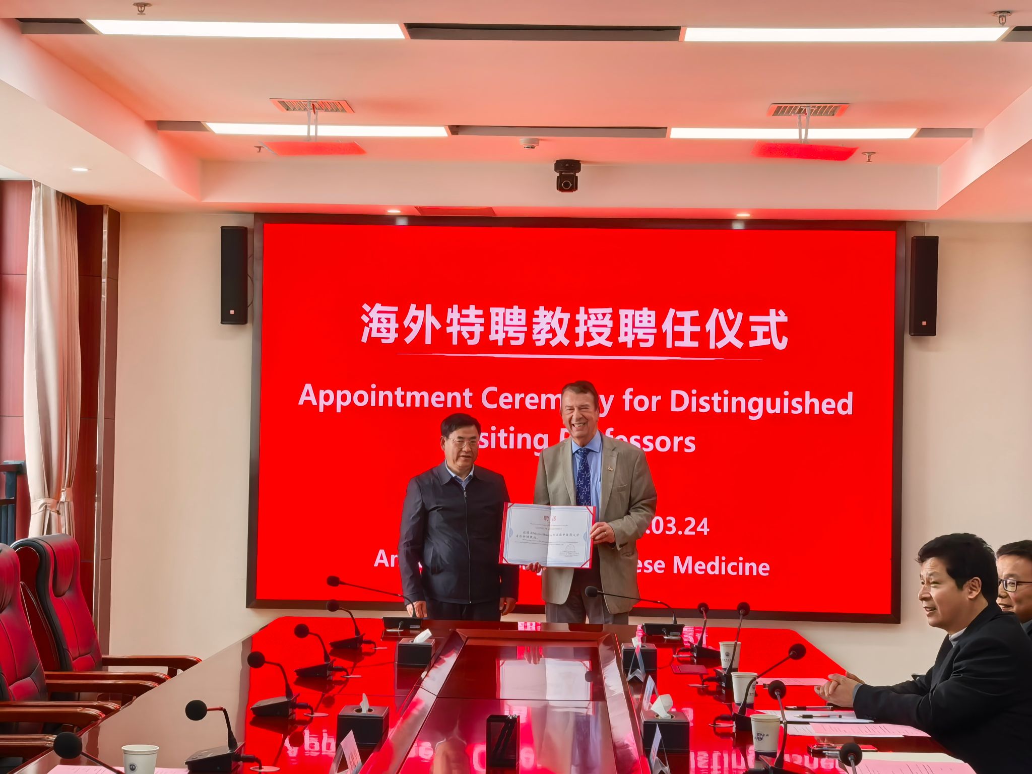 为加快推进学校“双一流”建设步伐,提升学校科研创新能力与国际影响力,3月24日下午,学校举行Michel Baudry教授聘任仪式。学校党委书记谢瑞瑾,美国西部健康大学教授毕晓宁,人事处处长蔡标,科技处处长汪天明,人文与国际教育交流学院党总支书记叶兰兰,中医学院党委书记张亚辉、院长方向明,副院长朱国旗参加。