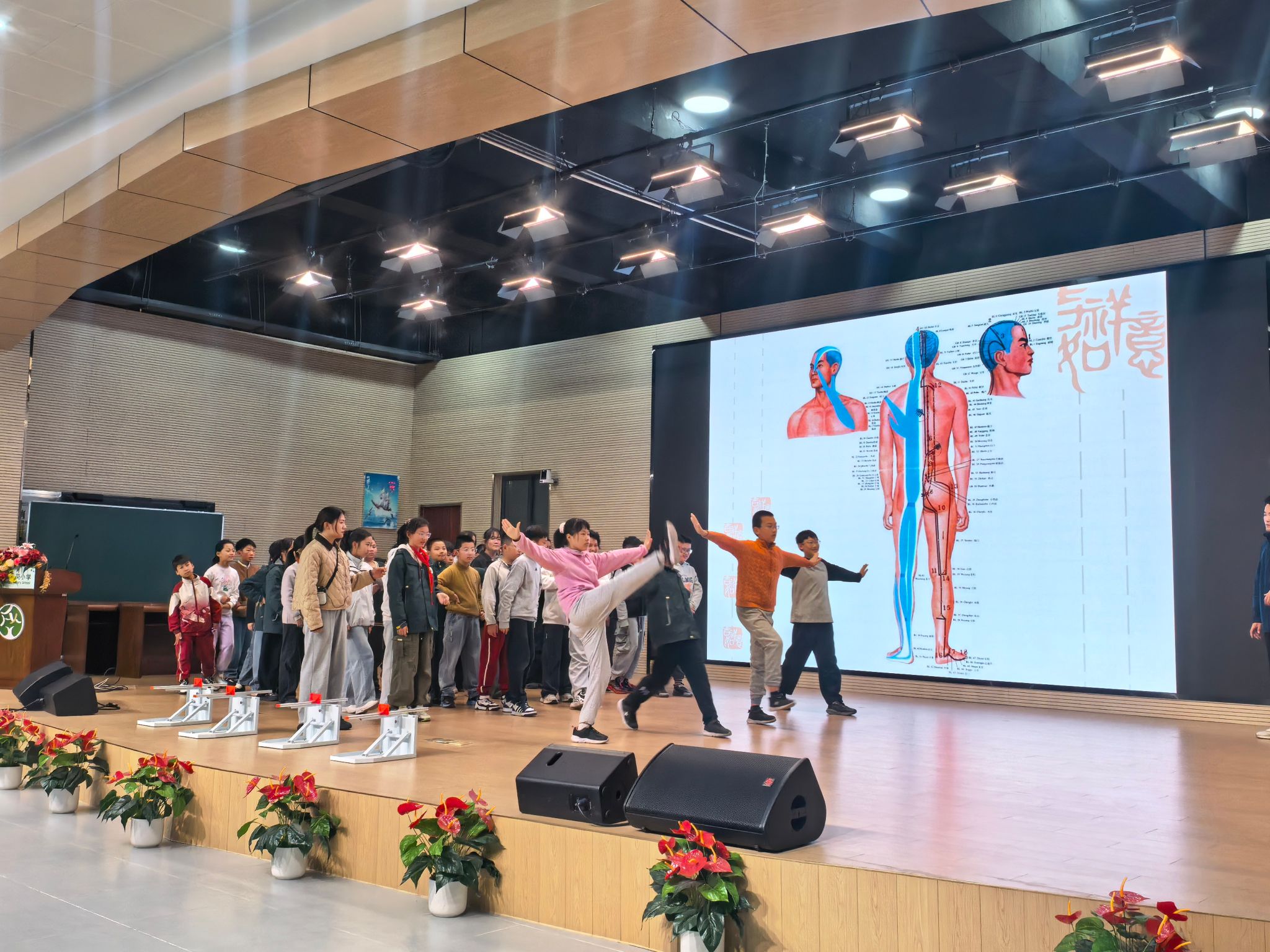 课堂上,徐寒与王静两位老师打破传统体育教学模式,首先展示了“人体经络图”,为小学生科普中医基础理论与坐位体前屈之间的关联,并围绕国家体测中的“坐位体前屈”项目,设计了一套融合中医理念的热身与训练流程。在教学过程中,两位老师将中医理论转化为通俗易懂的课堂语言:首先“肝主筋,肾主骨,脾主肌肉”——肝气疏泄正常,则筋脉柔和、关节灵活;肾精充足,则骨骼强健、腰膝有力;脾气健运,则肌肉丰实而富有弹性。想要提高柔韧性,需要调养肝、肾、脾三脏。其次经络通畅是关键——坐位体前屈主要涉及膀胱经(背部)、胆经(侧腰)、肝经与脾经(内收肌)、胃经(大腿前侧)等经络,并形象地比喻:“经络就像身体里的河流,河流通畅,气血就能到达四肢末端;如果阻塞了,就会感到僵硬疼痛。”再则“动则生阳,静则养阴”——动静结合,既能通过运动激发阳气、推动气血运行,又能通过静态拉伸滋养阴精,实现阴阳平衡。同时,课程特别设置了“调身、调息、调心”的“三调”养生法体验环节。“以前做坐位体前屈时,总感觉腿后侧像有根筋拉着,又硬又疼。今天拍打完委中穴再做,感觉腿变‘松’了,手一下子就推得更远了!”卫岗小学学生在课后兴奋地分享道。