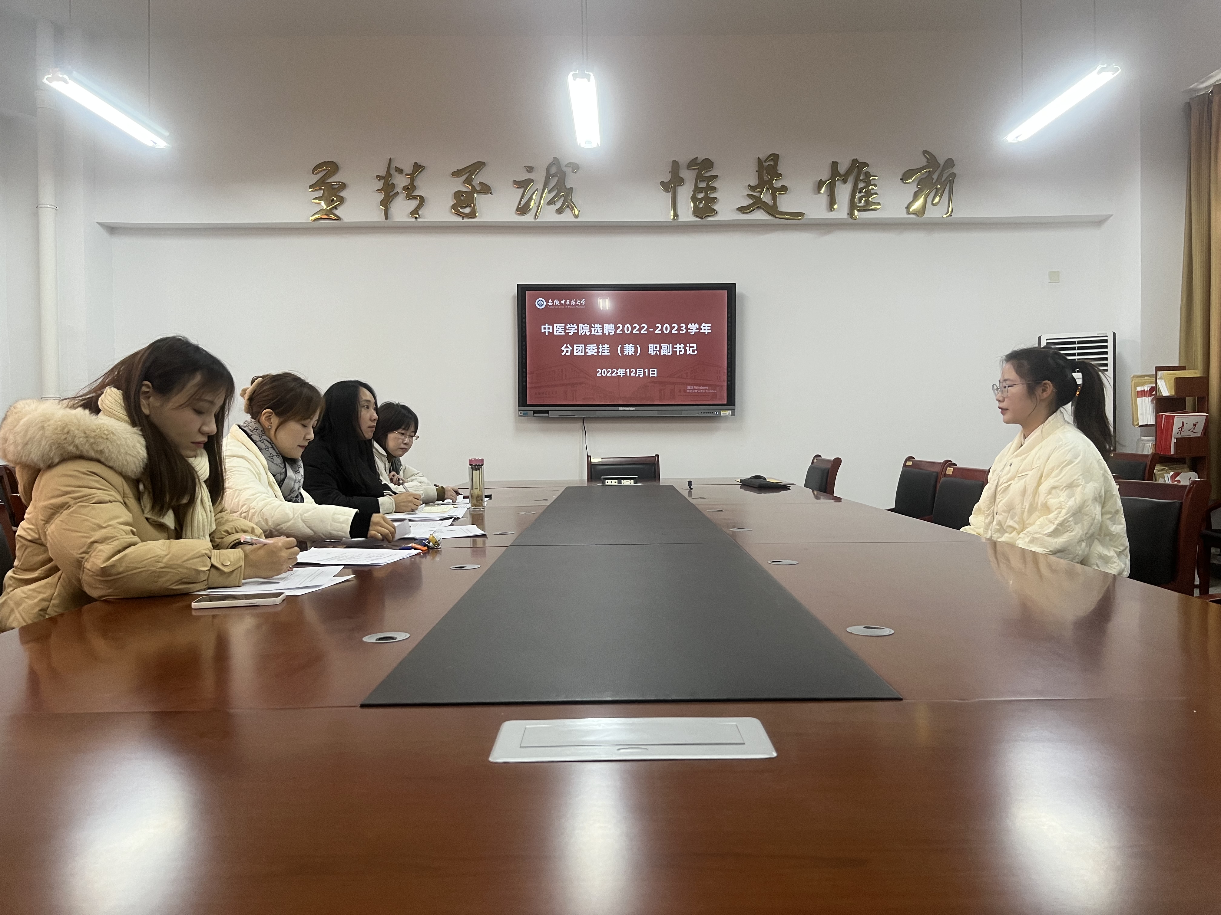 12月1日中午,中医学院开展2022-2023学年中医学院分团委学生兼职副书记竞聘面试工作。中医学院党委副书记宋婷婷、中医学院分团委书记徐慧、中医学院专职辅导员兼学生工作办公室主任方林莉、马克思主义学院专职教师、原护理学院分团委书记石玥担任此次竞聘面试的评委。
