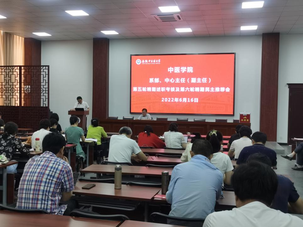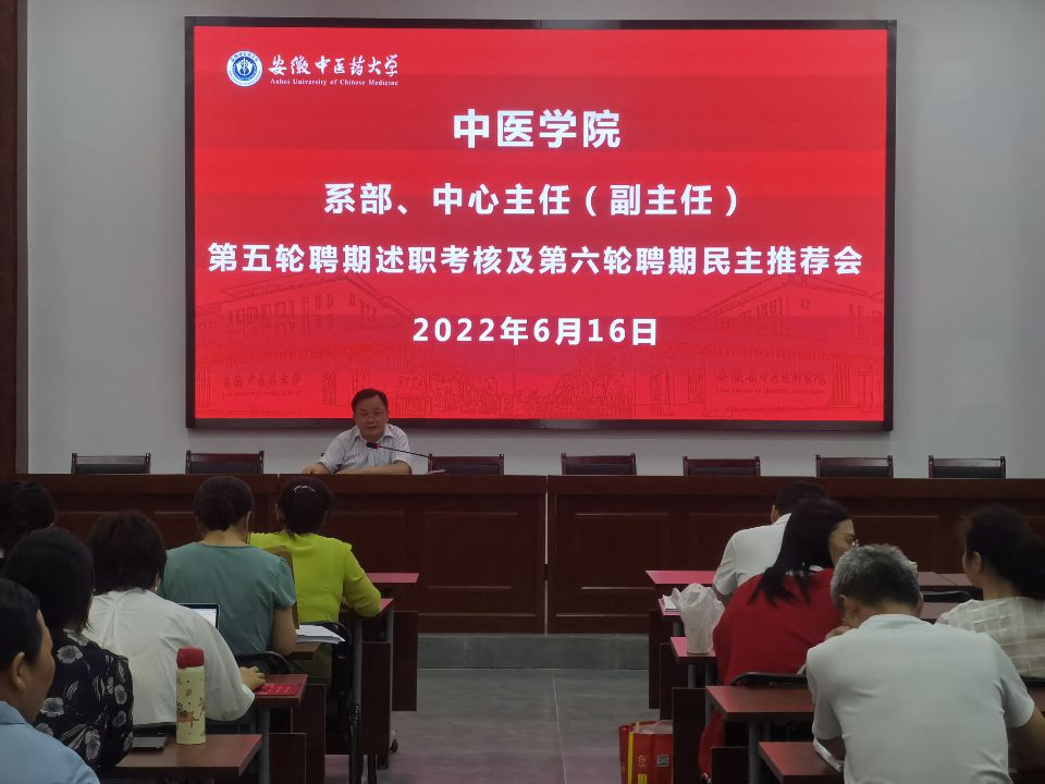 为了客观、公正、全面地考核系部、中心主任(副主任)履行岗位职责情况,根据《安徽中医药大学第六轮聘期专业技术人员和科级以下工作人员聘用工作实施办法》文件要求,中医学院于2022年6月16日下午在宅仁堂组织召开学院各系部、中心主任(副主任)第五轮聘期主任(副主任)述职考核会及第六轮聘期主任(副主任)民主推荐会,中医学院全体教职工参会。会议由中医学院院长方向明主持。