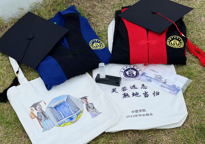 学院还为毕业生精心准备了毕业纪念礼包,包含一个帆布袋、一套学位服、一片口罩和一枚印章。帆布袋由学院本科生原创绘制,祝福毕业生一“帆”风顺、前程似锦;学位服寓意“学”业有成,再创辉煌;中医学子定制版口罩,提醒毕业生要遵守疫情防控政策,关“罩”健康;刻有校徽和毕业生姓名的专属印章,寓意母校和同学们心心相“印”,印章上还刻有“芙蓉远志 熟地当归”,提醒毕业生在追求人生理想的同时不忘中医学院这一坚强后盾,常回家看看。